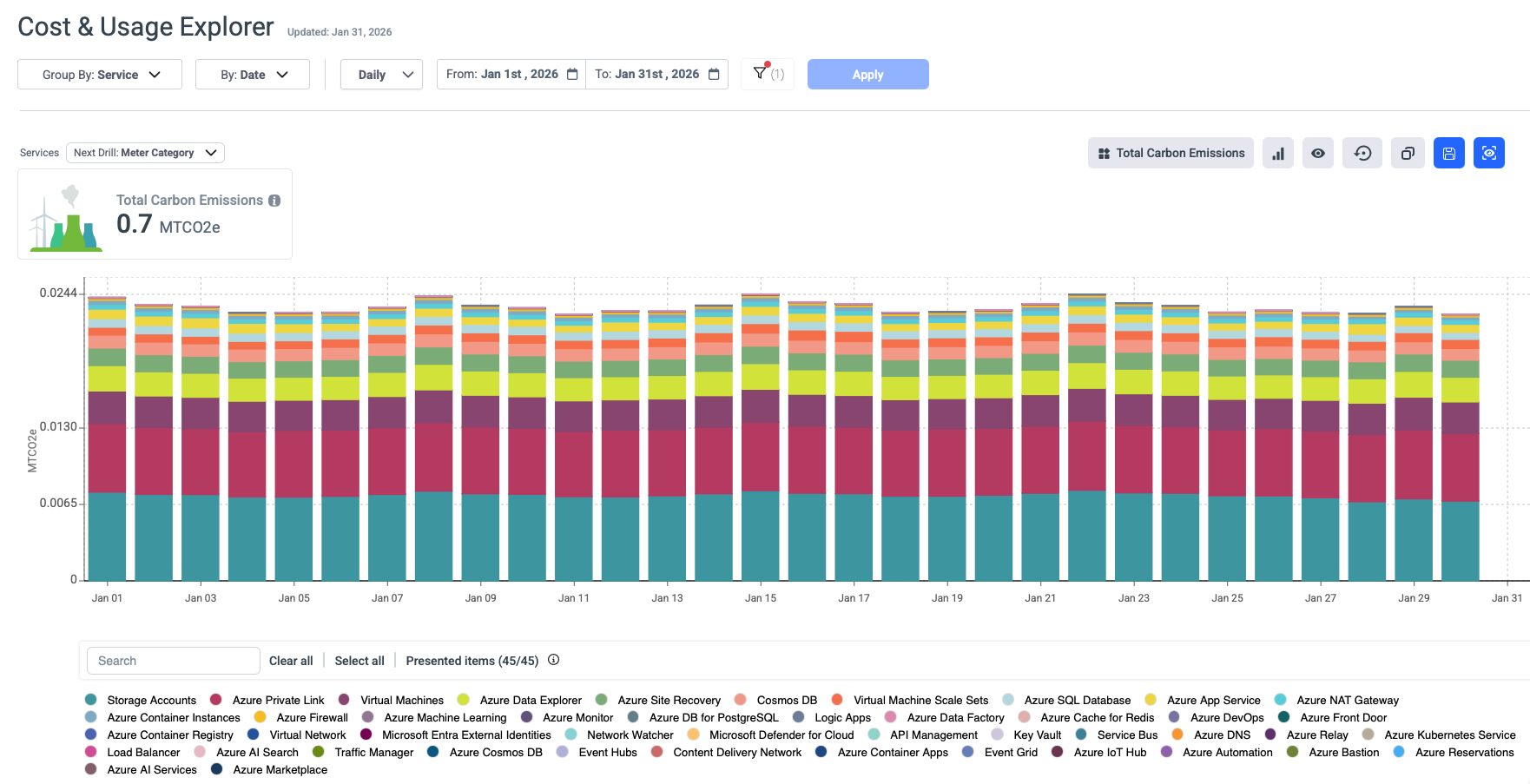 The GreenOps capability for Azure provides visibility into the carbon footprint of your cloud usage, helping teams understand and manage the environmental impact of their workloads. It surfaces emissions data alongside cloud consumption, enabling more informed decisions that balance cost, performance, and sustainability goals. Contact our support team for more details.