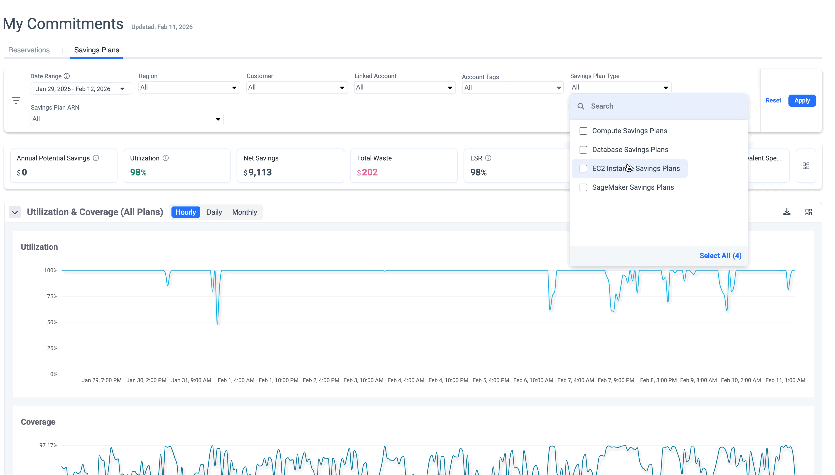 The My Commitments-AWS Savings Plans page gives a consolidated view of Savings Plan performance across AWS-linked accounts and services. It includes utilization and coverage metrics, on-demand equivalent cost comparisons, and visibility into net savings and unused commitments. The dashboard supports filtering by date range, region, linked account, services, and ARN, and allows drilling down into individual plan details and chargeback breakdowns. Database Savings Plans are supported as part of the new experience.