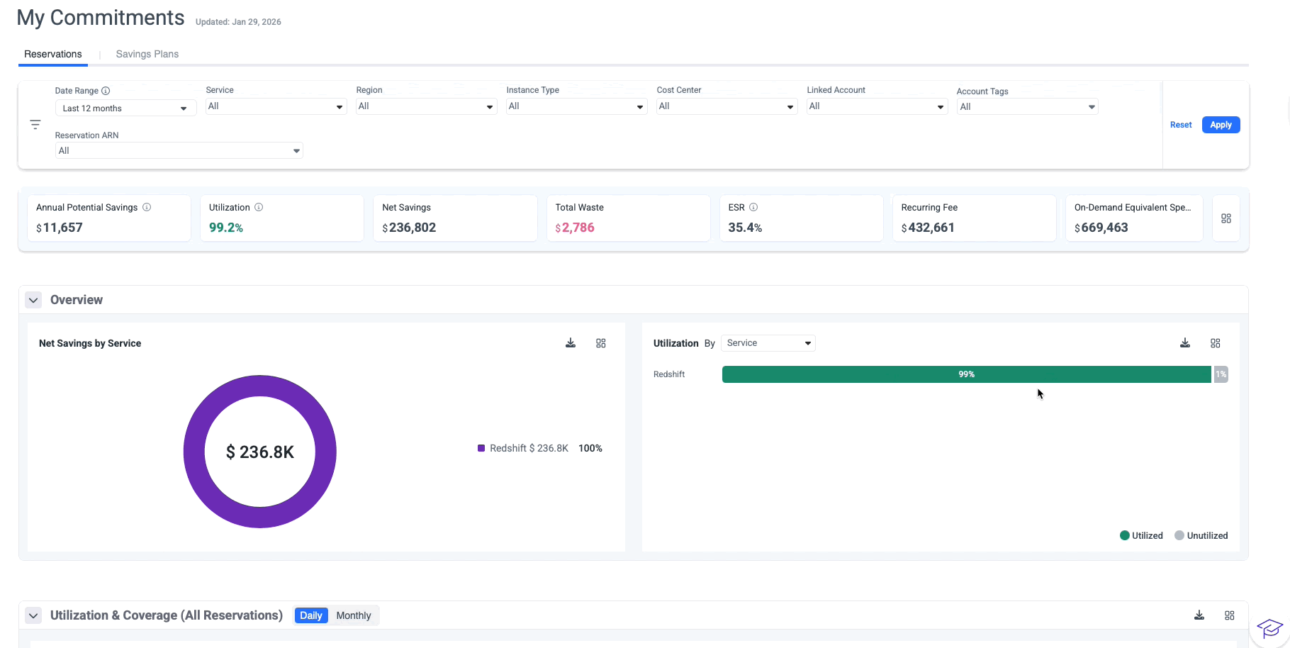 The My Commitments-AWS Reservationsprovides a consolidated view of Reserved Instance performance across AWS-linked accounts and services. It includes utilization and coverage metrics, on-demand equivalent cost comparisons, and visibility into net savings and unused reservations. The dashboard supports filtering by date range, region, services, linked account, instance type, and ARN, and allows drilling down into individual reservation details and chargeback breakdowns.