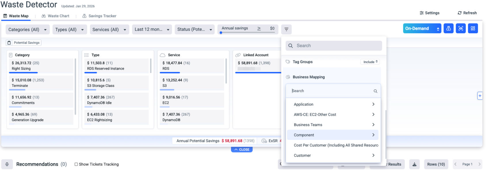 The Business Mapping filter in the Waste Detector allows teams to filter recommendations based on business mapping relationships derived from the underlying resources. This helps align optimization insights with business context, making it easier to focus on recommendations that are relevant to specific teams, services, or cost centers.