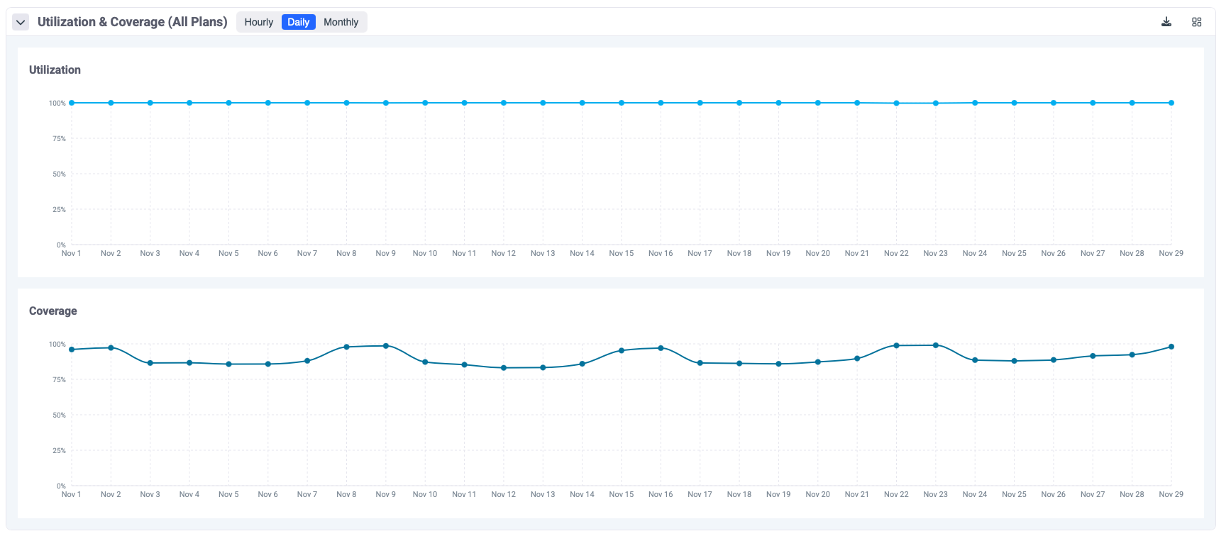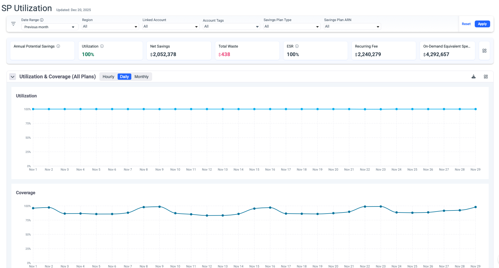 - Track utilization and coverage metrics across all active Savings Plans.
