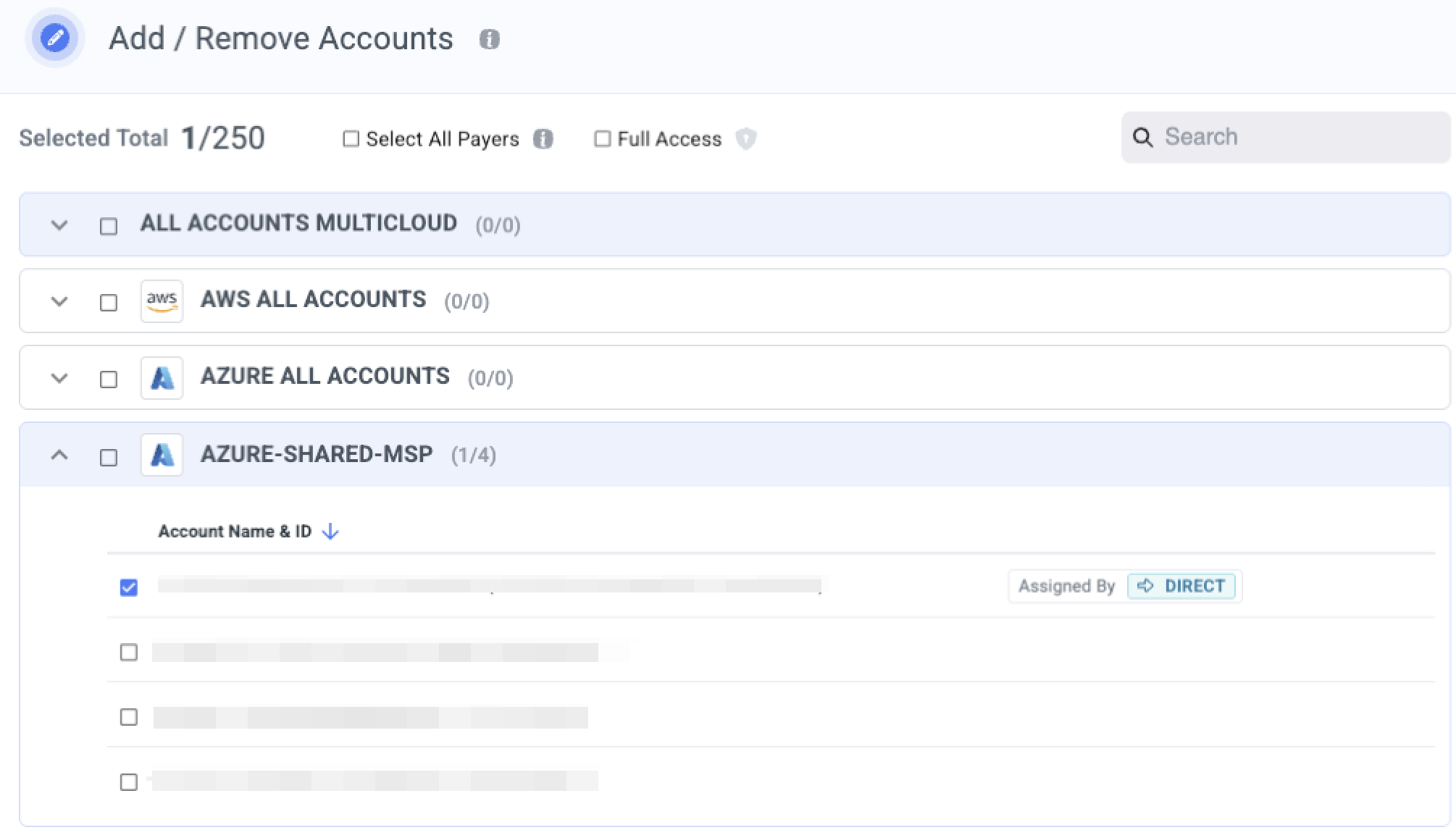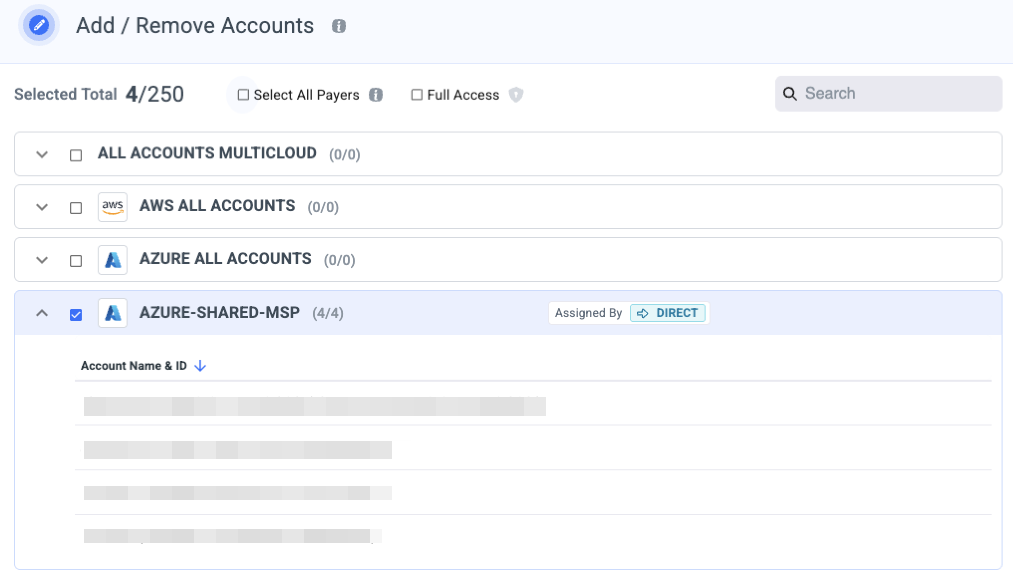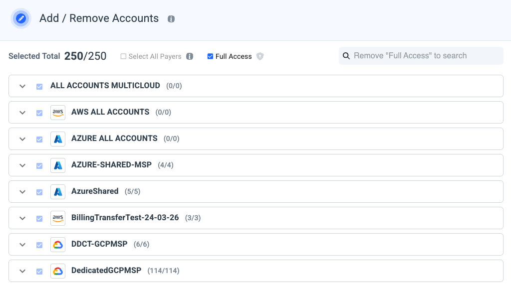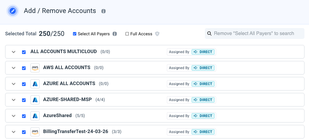 Check the full access box to provide access to any of your payer accounts, available now or onboarded later and all linked accounts which available now and these that will be added later to the role.