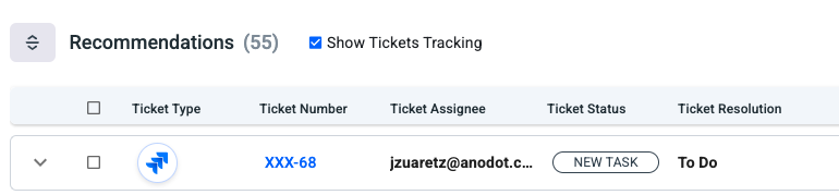 Once the Jira ticket is created, the recommendation is marked as linked to a Jira ticket: