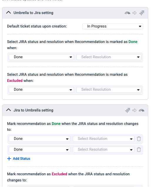 - Umbrella → Jira: Marking a recommendation as Done or Excluded in Umbrella will automatically update the linked Jira ticket’s status in the Jira Platform.