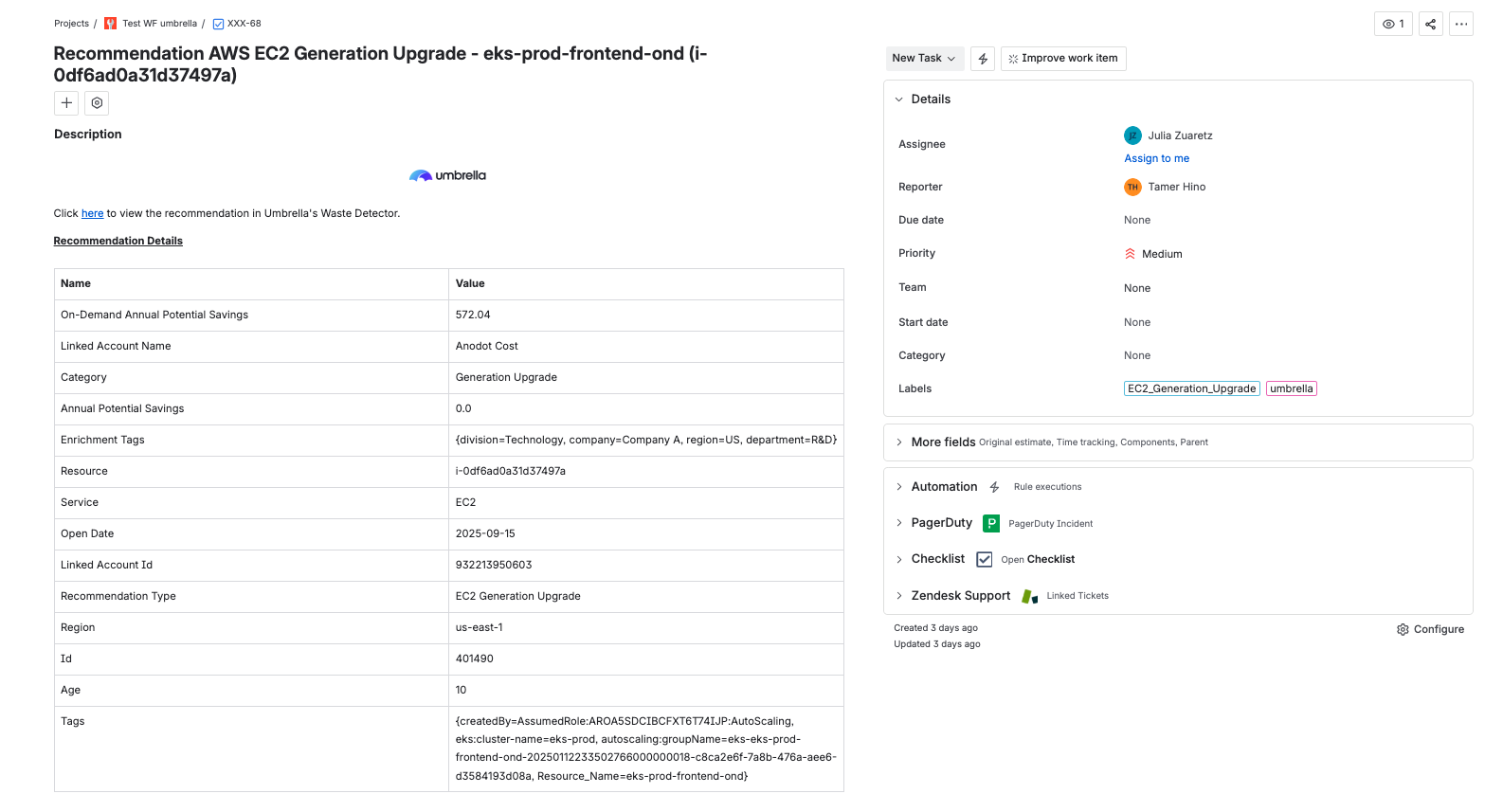 - If a Jira ticket is closed but the status or resolution isn’t synced with Umbrella for any reason and the recommendation closer is failing, the recommendation won’t be marked as Done; however, the comment in the Waste Detector recommendation will still be updated.